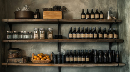 Discover a charming vintage kitchen scene featuring rustic shelves filled with glass containers, bottles, and fresh oranges, creating a warm and inviting atmosphere.