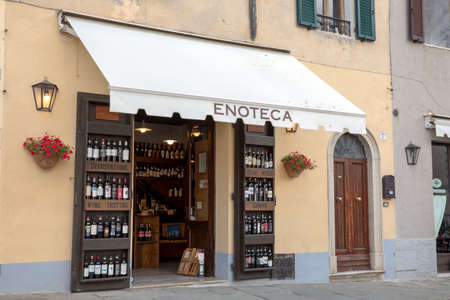 Montalcino (SI), Italy - August 15, 2021: Wine shop in Montalcino village, Tuscany, Italy