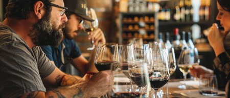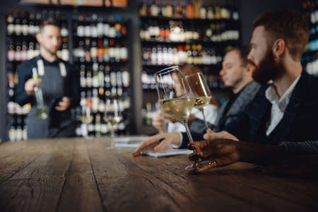 Closeup hand with glasses White wine tasting in restaurant with lecture from male sommelier