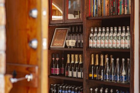 Budva, Montenegro - 05 june 2020: A wooden wine cabinet with bottles of wine.
