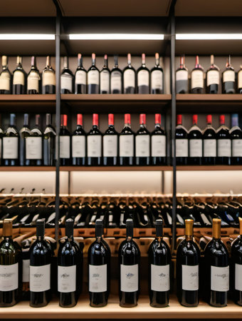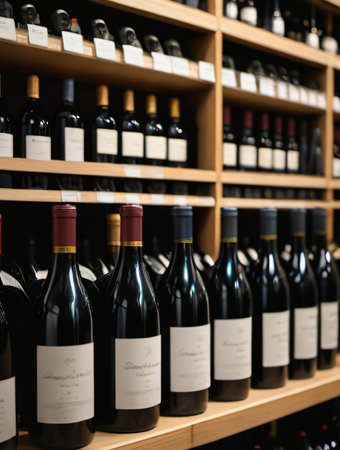 A well-organized display of various bottles of wine on wooden shelves in a wine store, offering a variety of choices in an elegant setting.