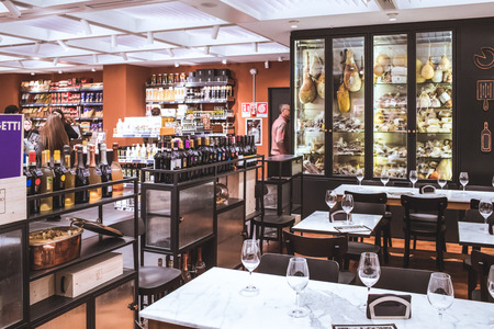 ROME, ITALY - DECEMBER 30, 2017: San Gregorio restaurant on the sixth floor of the new La Rinascente shopping mall in Rome, nice place for taste italian food and wine in the atmosphere of a contemporary food shop.