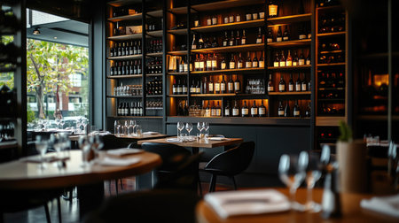 Stylish restaurant interior showcasing an inviting dining area with wine shelves and elegant table settings. Perfect for a cozy evening out or special occasion.