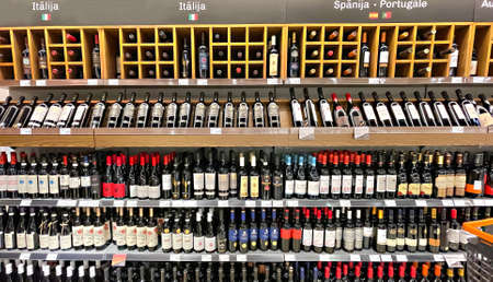 Latvia, Riga, February, 2022 - Interior of modern wine boutique store with vintage style wooden luxury showcases. Shelves with various of wines from Italian and Spanish vineyards in the shopping mall