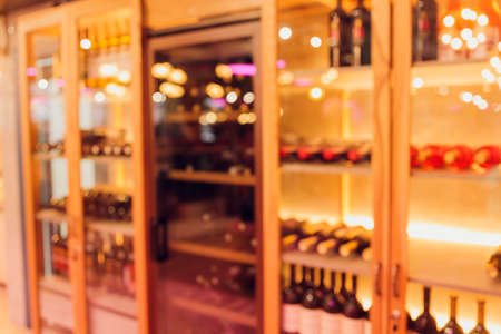Many glass wine bottles on shelves interior in restaurant. Blurred background