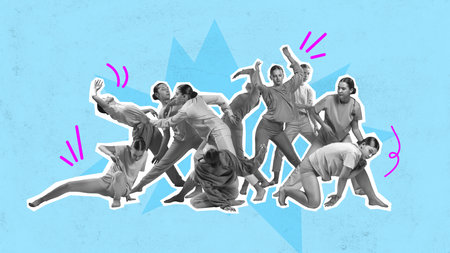 Group of young people, dancers performing contemp, modern style dance over blue background. Contemporary art collage. Concept of party, dance, hobby, movements, fashion, creativity