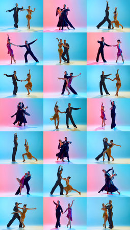 Energetic collage. Latin ballroom dancers in shiny dresses performing expressive choreography in pair against pastel gradient background.