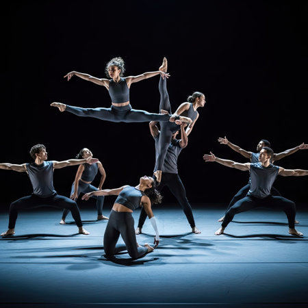 Dancers on stage, choreography with elements of theatrical production