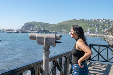 beautiful mexican girl playing with telescope on the pier in front of the sea