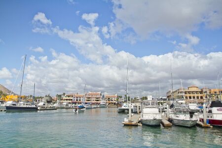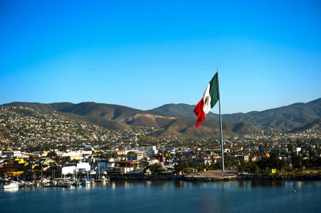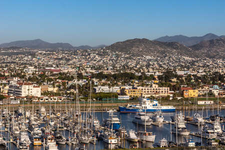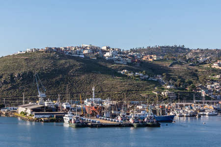 Ensenada, Mexico - January 17, 2012: Yachts and pleasure vessel s moored in the port. Backed by citiscape on hill slope and mountains on horizon under blue sky.