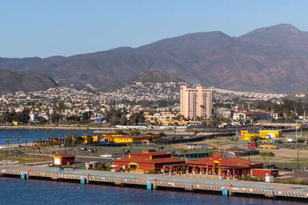 Ensenada, Mexico - January 17, 2012: Closeup of Red Cruise Terminal at pier of harbor with cityscape on slope of mountain in back and behind blue bay water. Pink Villa Marina Hotel towers over all else.