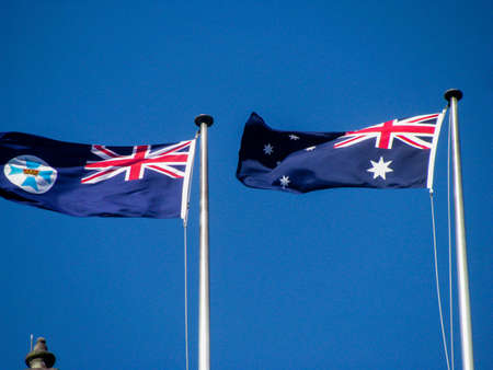 Australian flags background, with red white and blue Southern Cross flags against a dark blue background.