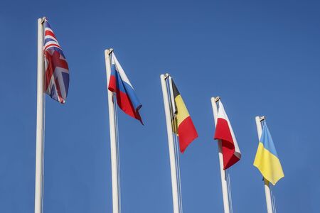 Flags of Germany, USA, Great Britain, Spain, Poland and United Europe. Concept of international relations.
