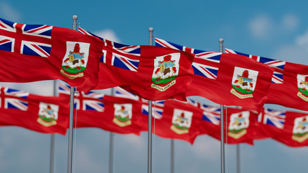 Bermuda islands many flags in row waving together on blue cloudy sky