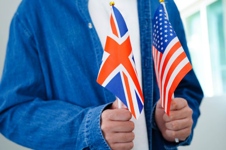 American Flag hanging with Union Jack British Flag next to the White House, Washington, DC, symbolizing the Special Relationship between England and America, the two countries that share the oldest international relationship