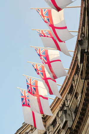 A colourful line of Union Jack flags hanging from a roof in London UK