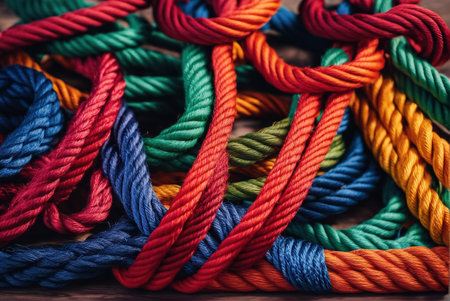 Network of Interconnected Colorful Ropes Symbolizing Unity, Teamwork, and Collaboration