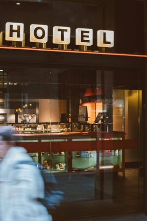 Barcelona, Spain - Nov 14, 2017: Vintage film style over woman silhouette in front of Hotel Casa Camper Barcelona owned by the same brand name shoe company on the Carrer dElisabets street