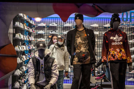 BELGRADE, SERBIA - OCTOBER 31, 2020: Client in a shoe store footwear boutique standing and checking shoes wearing a respiratory face mask in Belgrade.