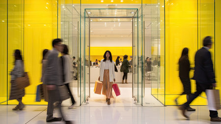 Bustling scene inside a modern shopping area, with people moving throughout the brightly lit, glass-fronted space. The vibrant yellow walls and clear glass fronts define the space. Shoppers are carrying shopping bags.