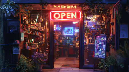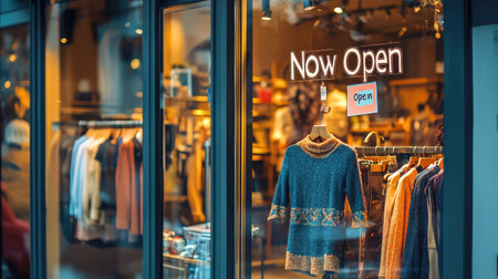 A beautifully lit storefront showcases a variety of cozy fashion apparel with a Now Open sign, creating an inviting atmosphere perfect for urban shopping experiences.