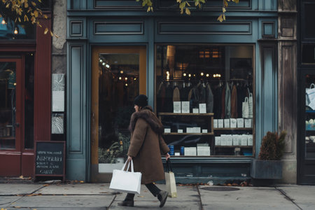 Stylishly dressed woman is walking down a city sidewalk holding shopping bags and passing by a storefront