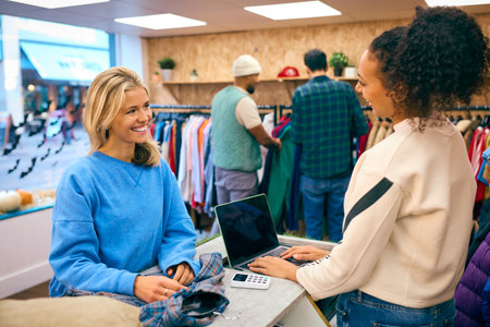 Woman Buying Shirt From Female Sales Assistant At Cash Desk In Fashion Store