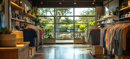 cozy, well-lit clothing store with neatly arranged apparel, shelves, and warm ambient lighting