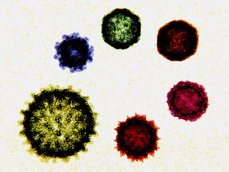 6 human-infecting viruses: from the bottom left, clockwise: influenza virus, norovirus, coxsackie virus, enterovirus D68, poliovirus, adeno associated virus. A virus is an infectious particle smaller than a bacterium and can only reproduce itself after infecting a host cell. They do not have an own metabolism and need therefore the host cell.