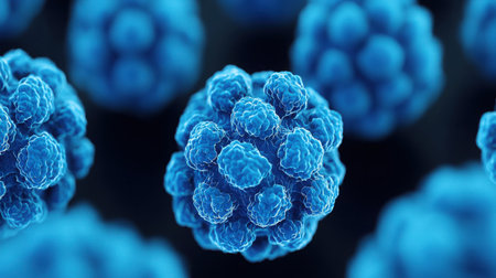 This image showcases a detailed close-up of blue viral particles in a microscopic setting, illustrating infection and cellular structure for educational and scientific use.
