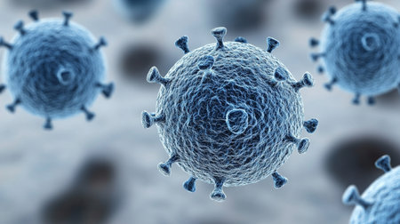 Detailed representation of a virus with spikes visible in a microscopic view highlighting its structure and potential effects