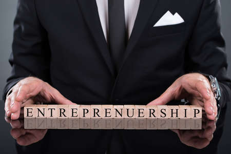 Midsection of businessman showing Entrepreneurship blocks arranged on desk