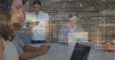 Image of connections and data processing over diverse business people in office. Global finance, business, connections, computing and data processing concept digitally generated image.