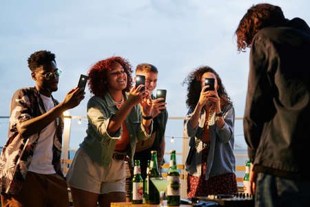 Two happy young intercultural couples with smartphones taking photo of deejay at rooftop party while standing in front of him