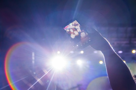 Taking a photo by mobile phone at a concert in front of the stage light
