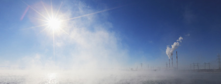 Smoke from the chimneys of a steel plant in winter at sunset.