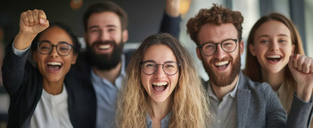 A joyful group of young professionals celebrates their achievement with excited expressions and raised fists, showcasing unity and happiness in a modern office setting.