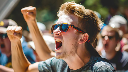 Young man in sunglasses excitedly cheering outdoors at a sports event