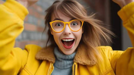 Excited Young Woman in Trendy Denim Jacket and Yellow Shirt Showing Excitement with Open Mouth and Raised Fists Against a Teal Background AI Generative