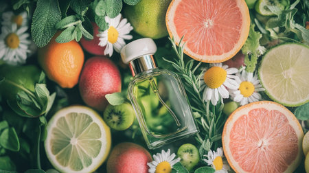 A refreshing perfume bottle placed among vibrant fruits and herbs, capturing the essence of nature and beauty, perfect for promoting freshness and vitality.