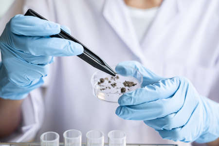 Scientist in blue gloves doing experiment with plant sample in laboratory