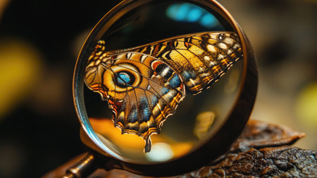 A stunning close-up of a butterfly viewed through a magnifying glass, highlighting intricate details and vibrant colors against a natural backdrop.