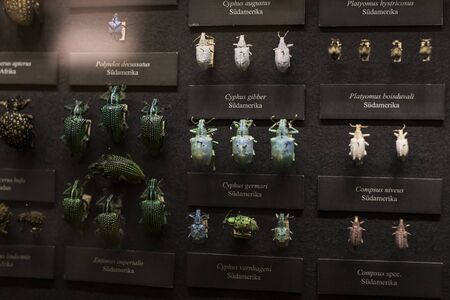 Russia - February 2021: collection of exotic insects. Pharmaceutical garden, Moscow, Russia.
