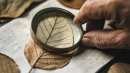 A botanist's study with a magnifying glass over a delicate leaf, capturing intricate details.