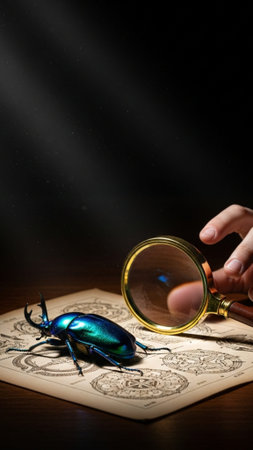 A closeup of a bug and a magnifying glass on a dark background