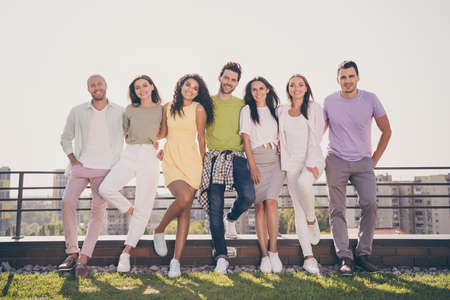 a group of seven successful business people men and woman in stylish suits standing and looking proudly outdoors . teamwork and the multiethnic company concept