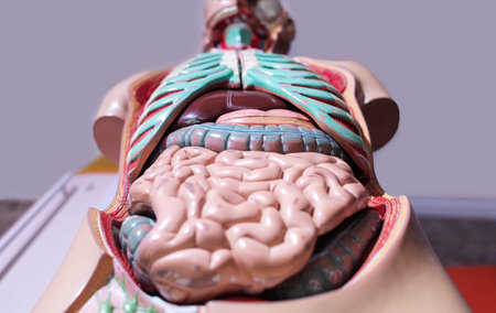 Medical mannequin. Close-up of abdominal organs created from plastic and simulating the human body. The concept of training medical personnel, doctors and students.