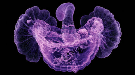 This artwork displays a detailed organic structure rendered in purple hues, highlighting the intricacies of the design for scientific educational use.