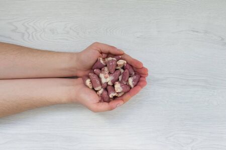 Man's hands holding raw chicken hearts on white wooden background, copy space