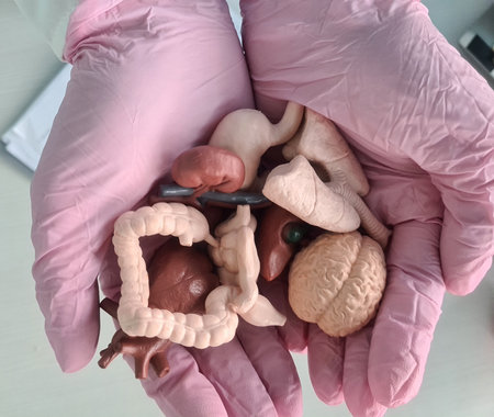 Hand in glove close up holding 3d human model with inner organ system. Anatomical structure.